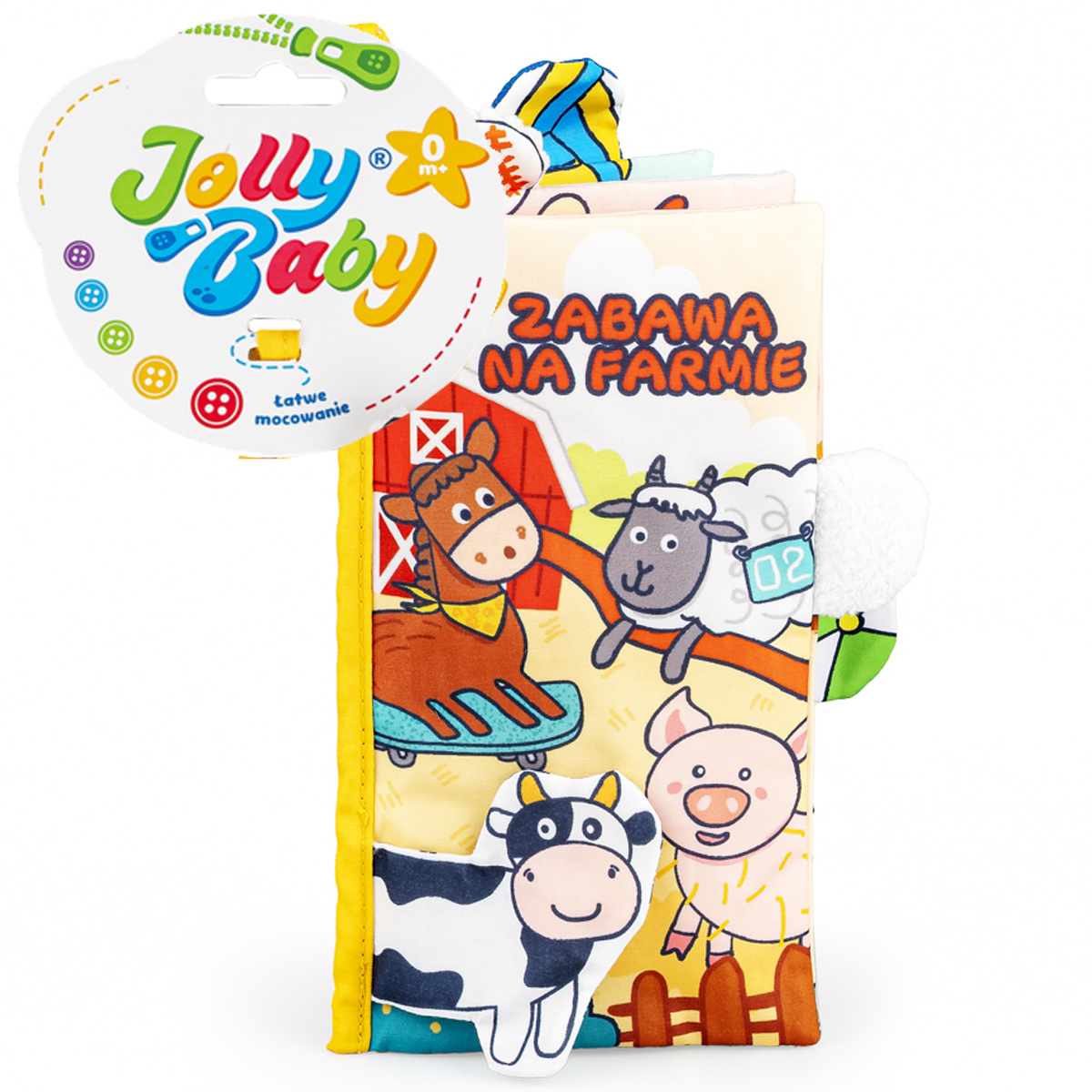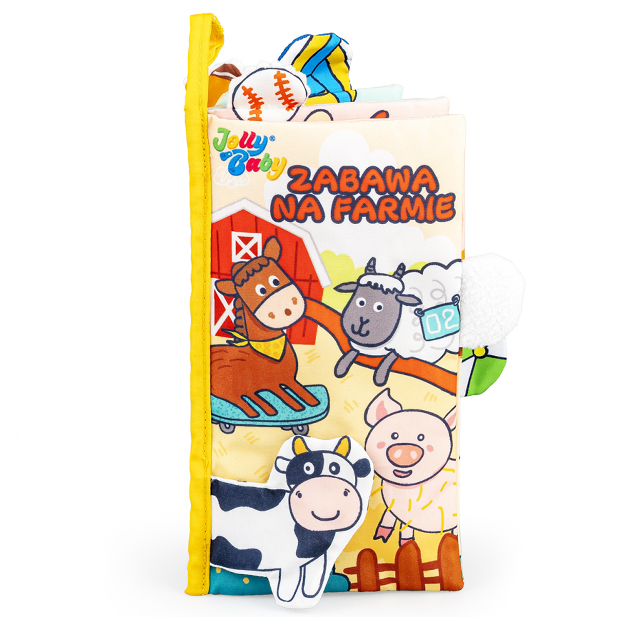 Wiejskie zwierzątka zapraszają maluszki do wspólnej zabawy w oglądanie obrazków i odkrywanie zróżnicowanych faktur materiałów! Książeczka wyposażona została w szeleszczącą okładkę i barwne strony, z których wystają różne, materiałowe elementy. Na poszczególnych stronach na najmłodszych czekają krótkie zdania w języku polskim, nawiązujące do obrazków. Praktyczna zawieszka pozwala przyczepić książeczkę w dowolnym miejscu, aby mogła towarzyszyć maluchowi podczas zabawy w domu, a także na spacerze. Produkt przeznaczony jest dla dzieci od dnia narodzin.