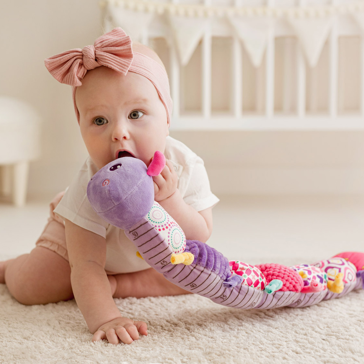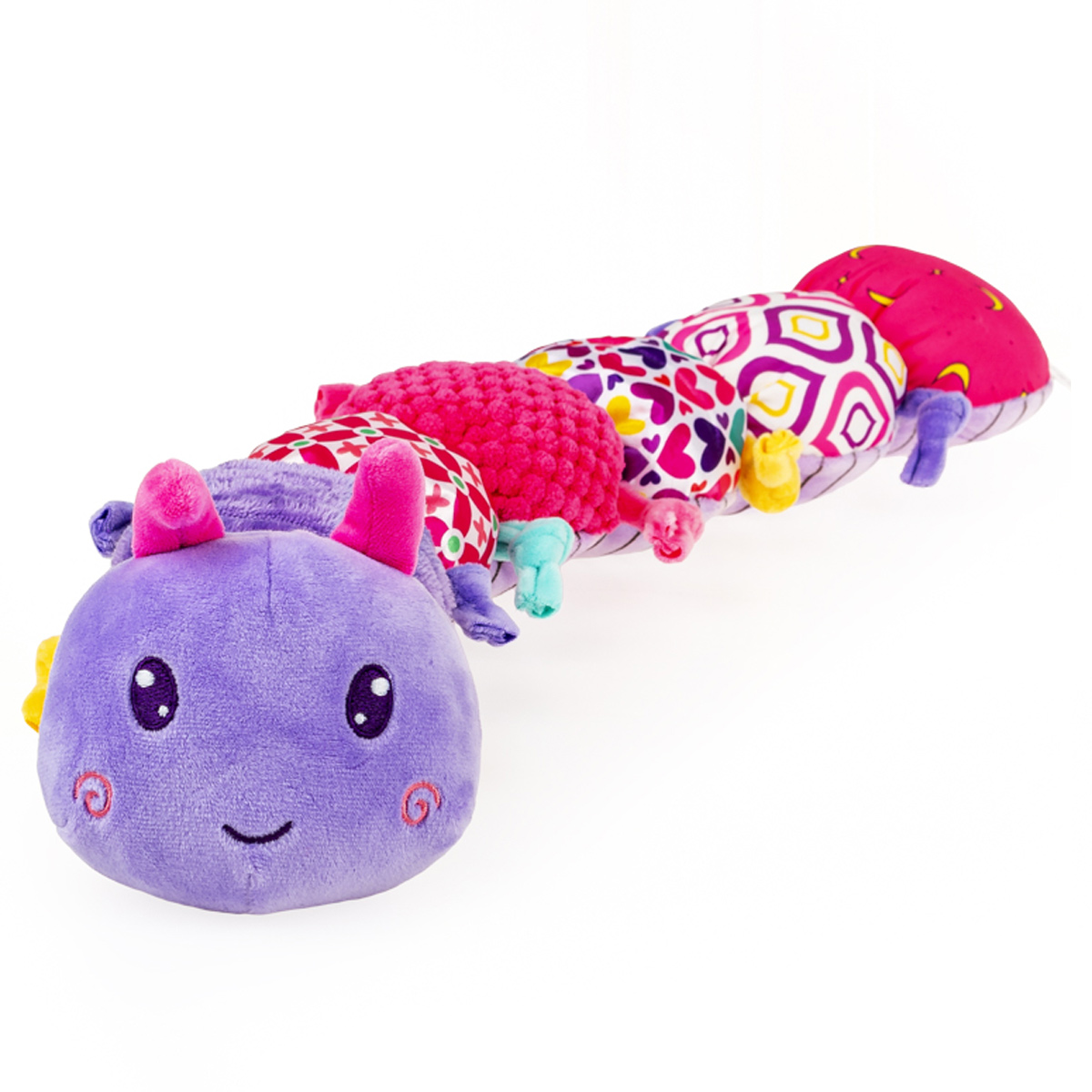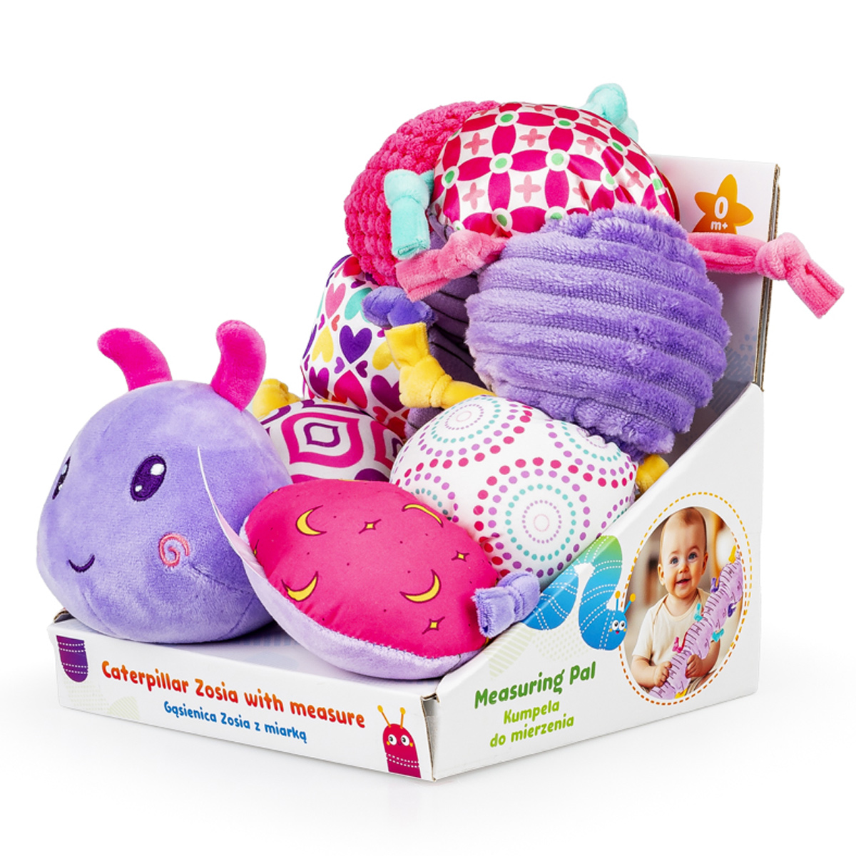 Kolorowa gąsieniczka grzechocze wesoło, zachęcając maluchy do wspólnej zabawy! Poszczególne segmenty jej ciałka uszyte zostały z materiałów o różnych fakturach, w tym takiego, który szeleści, a wszystko po to, aby stymulować zmysły dziecka, wpływając korzystnie na rozwój jego zdolności poznawczych. Zabawka wyposażona została w gryzaczek, kolorowe kółeczka oraz grzechotkę, ukrytą w ostatnim segmencie. Na brzuszku gąsienicy znajduje się miarka w centymetrach i calach, którą można wykorzysać do wesołych zdjęć dziecka z zabawką, a gdy maluch podrośnie – do nauki liczenia. Produkt przeznaczony jest dla dzieci od 10 miesiąca życia.