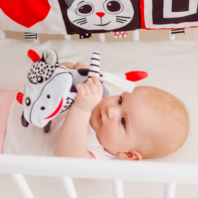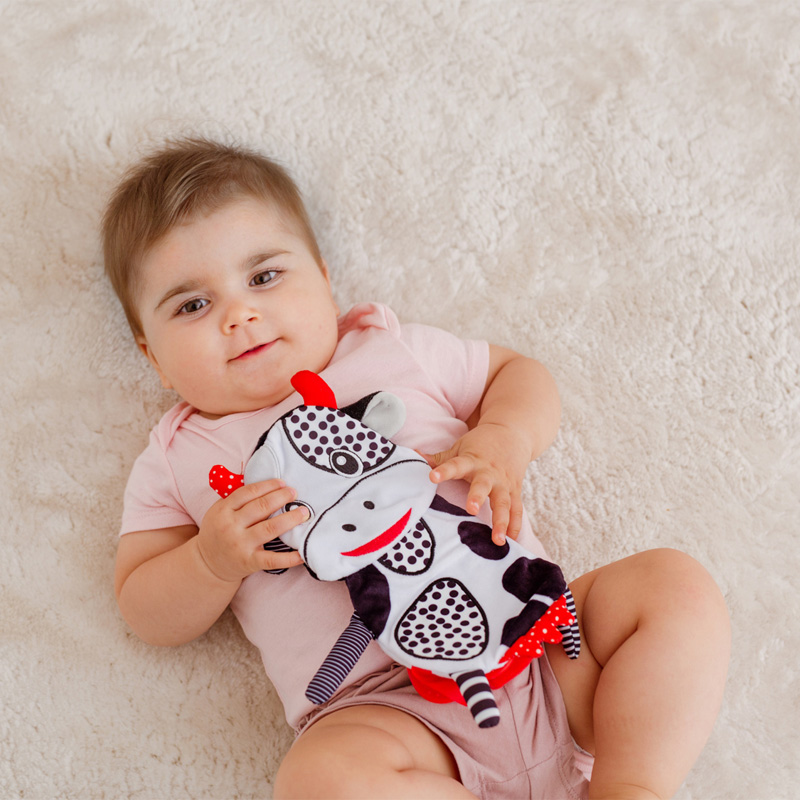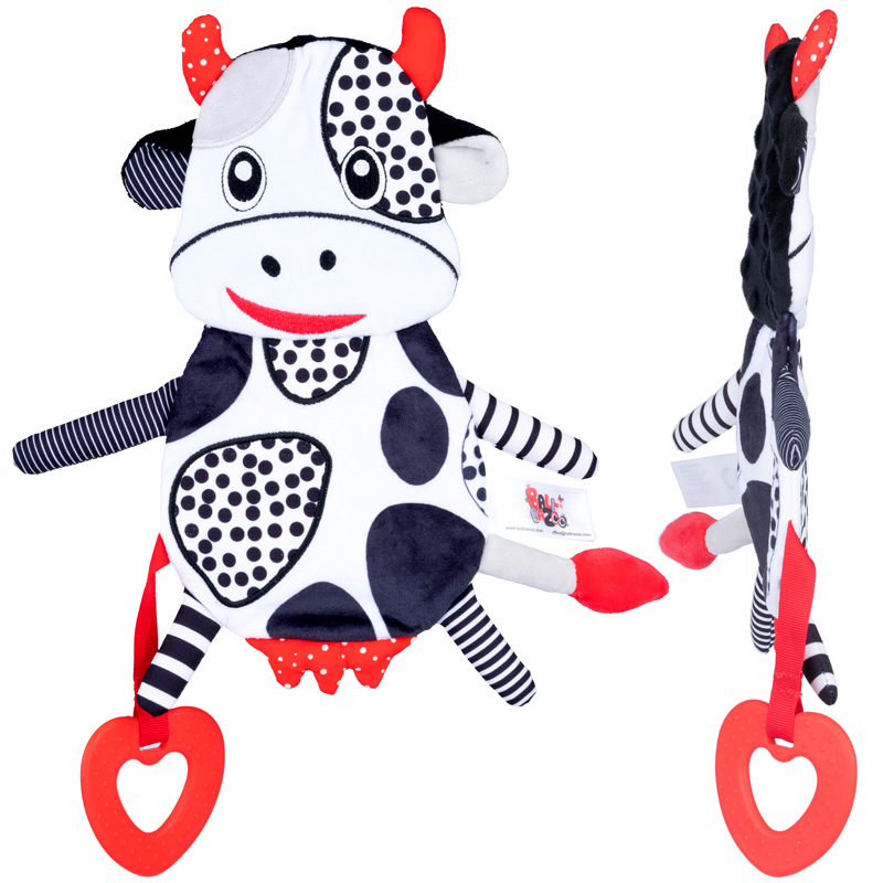 Kontrastowa krowa to rodzaj kocyka-szeleścika. Ta urocza krówka posiada wyjątkowe zdolności. Oprócz 3 najwcześniej rozróżnianych przez dziecko kolorów; białego, czarnego i czerwonego oraz prostych wzorów graficznych stymulujących wzrok, zabawnie szeleści podczas przytulania. Rozwija umiejętności poznawcze malucha dzięki zróżnicowanym fakturom materiałów, z których została wykonana. Dodatkowo przy nóżce zwierzaka znajduje się miękki gryzak z wypustkami, który jest pomocny podczas ząbkowania, masując obolałe dziąsła maluszka.