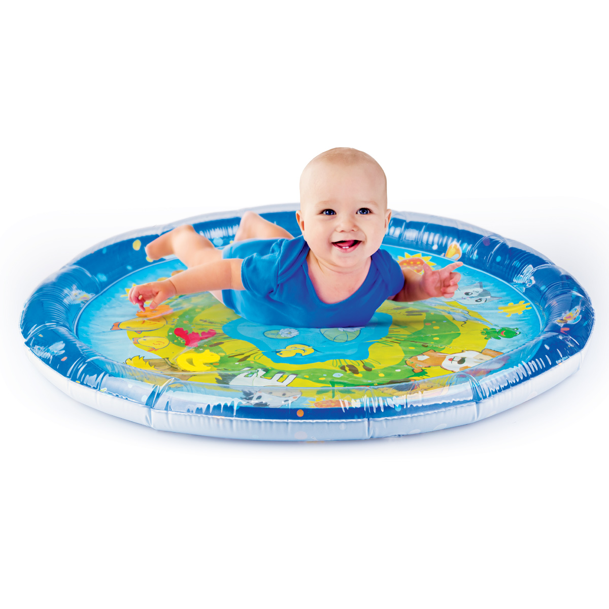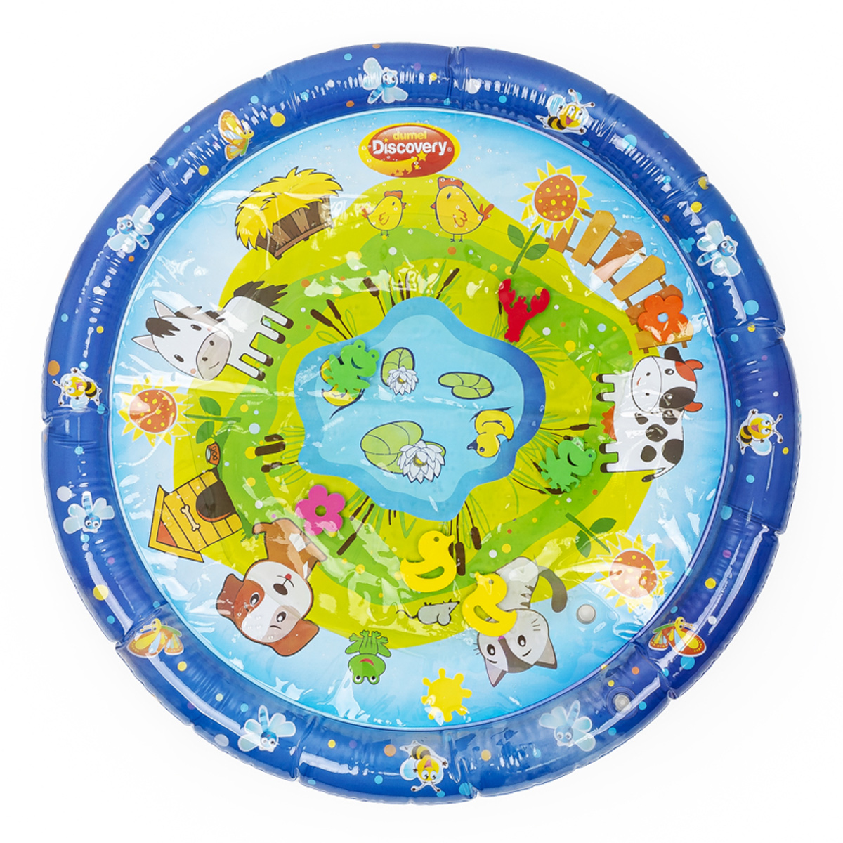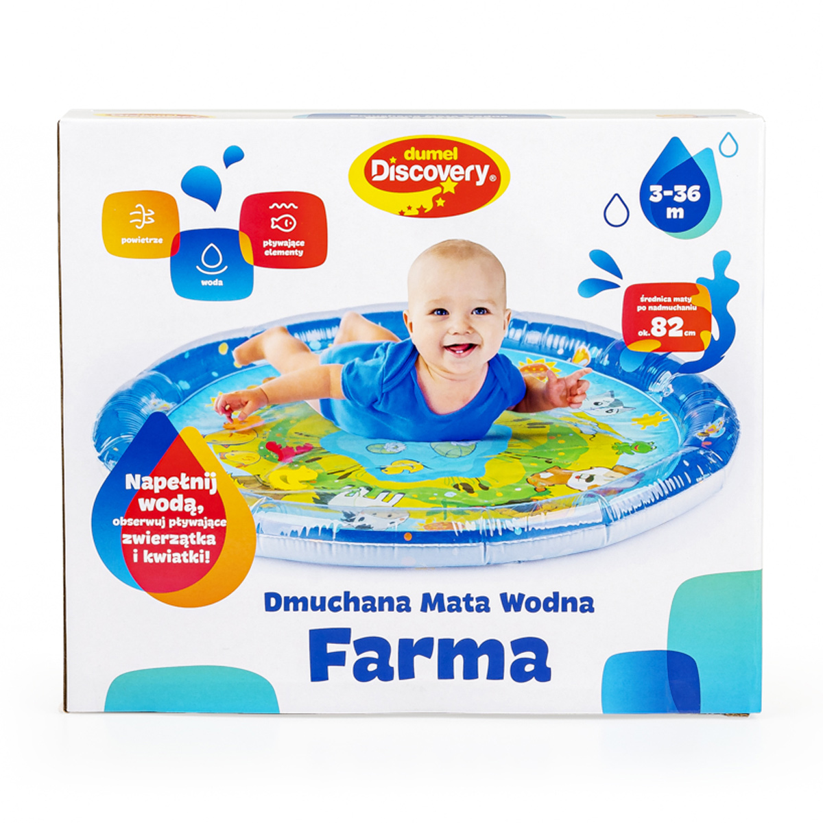 Wesołe dryfowanie bo bajkowym stawie! Duża mata zapewni maluchowi przestrzeń do zabawy w falowanie i obserwowanie kolorowych kształtów, pływających w jej wnętrzu. Krawędź zawiera zawór do nadmuchania brzegu maty, natomiast spód maty wyposażony jest w zawór do napełniania wodą. Kiedy dziecko usiądzie, położy się na środku maty lub przyciśnie go rączką, woda zafaluje, wprawiając w ruch kolorowe kształty. Aby mata mogła służyć jak najdłużej, należy napełniać ją wyłącznie wodą destylowaną i pamiętać o tym, aby po zakończonej zabawie wylać wodę, pozostawiając matę do wyschnięcia. Produkt przeznaczony jest dla dzieci od 3 do 36 miesiąca życia.