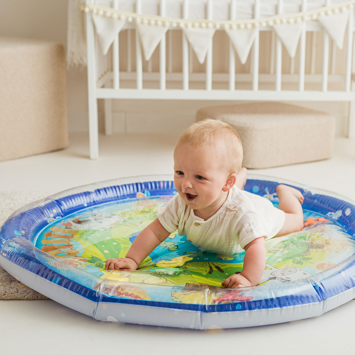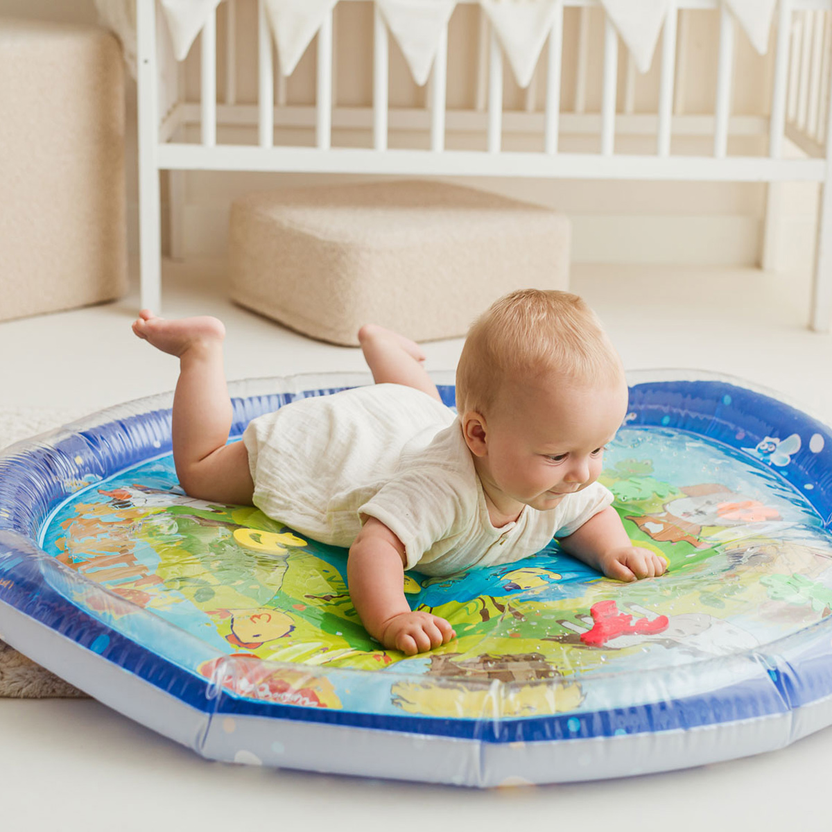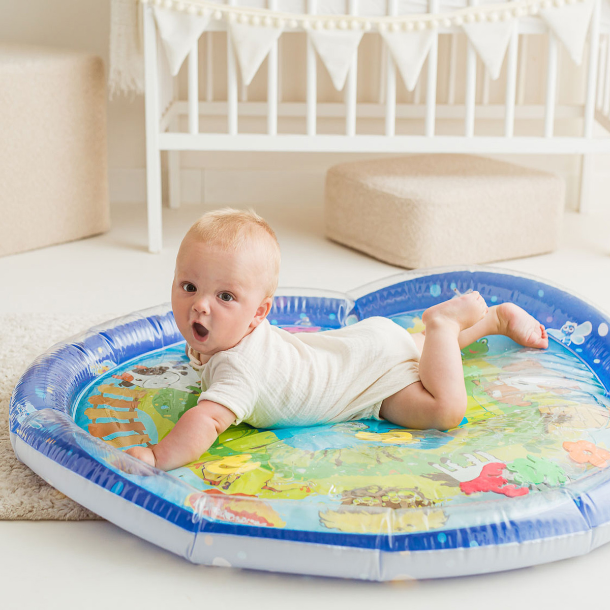 Wesołe dryfowanie bo bajkowym stawie! Duża mata zapewni maluchowi przestrzeń do zabawy w falowanie i obserwowanie kolorowych kształtów, pływających w jej wnętrzu. Krawędź zawiera zawór do nadmuchania brzegu maty, natomiast spód maty wyposażony jest w zawór do napełniania wodą. Kiedy dziecko usiądzie, położy się na środku maty lub przyciśnie go rączką, woda zafaluje, wprawiając w ruch kolorowe kształty. Aby mata mogła służyć jak najdłużej, należy napełniać ją wyłącznie wodą destylowaną i pamiętać o tym, aby po zakończonej zabawie wylać wodę, pozostawiając matę do wyschnięcia. Produkt przeznaczony jest dla dzieci od 3 do 36 miesiąca życia.